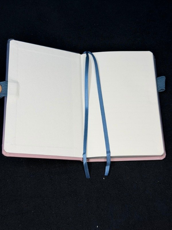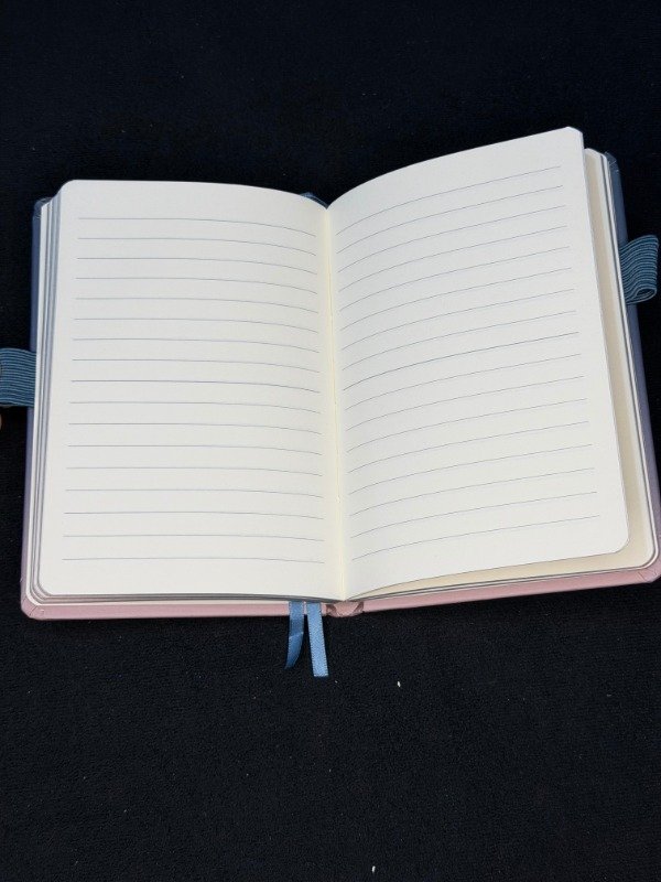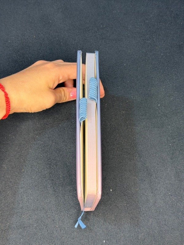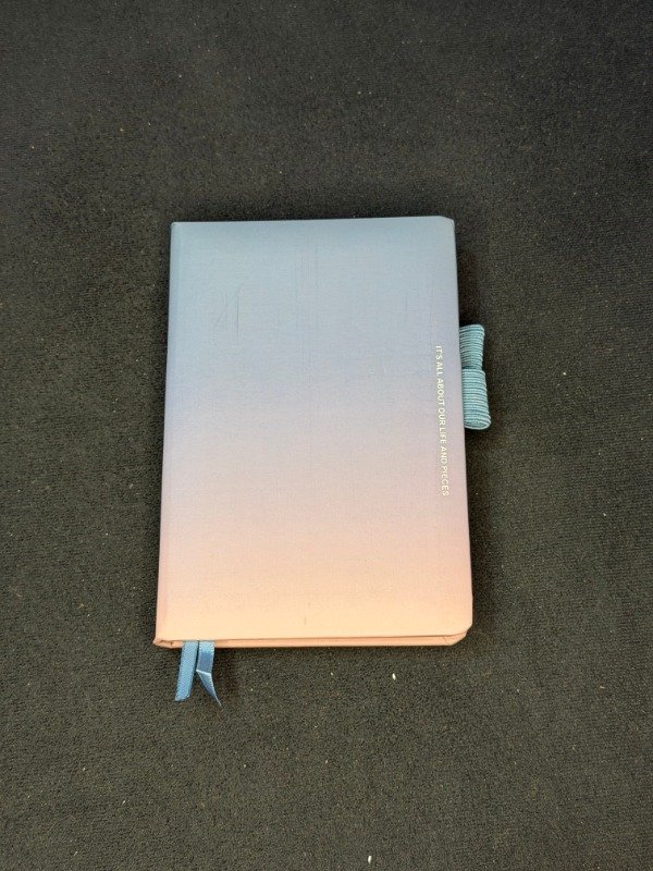 Libreta practica y elegante, con tapa dura de diseño degradè. Hojas rayadas color crema, 2 cintas señaladores y bandas elásticas laterales para mayor organización. Ideal para notas, estudio o journaling.