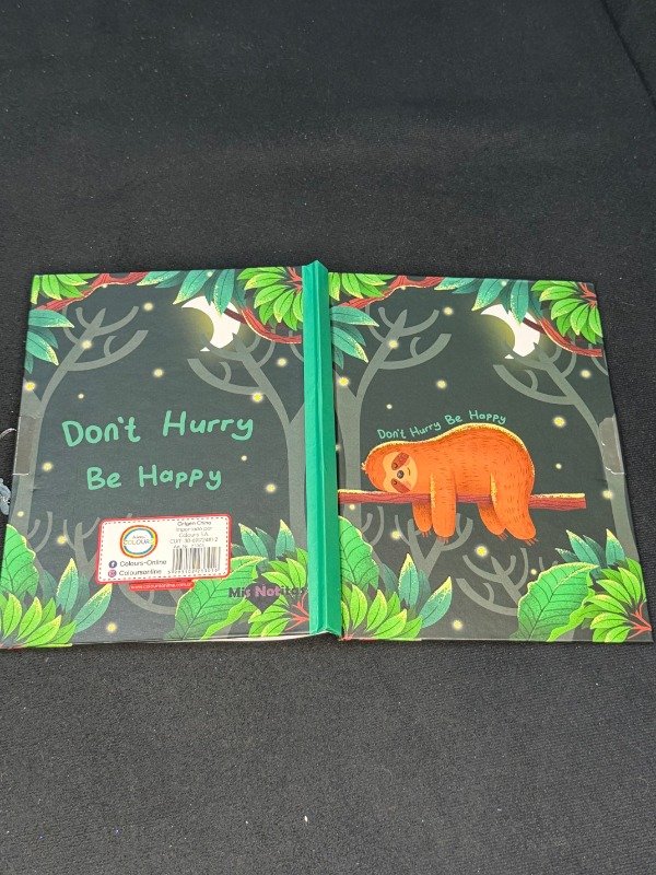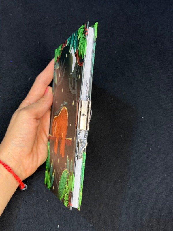 Cuaderno de tapa dura con diseño ilustrado de perezoso y hojas rayadas. Incluye candado con llave para mayor privacidad. Ideal para notas, journaling o estudio. Practico, resistente y perfecto para llevar a todos lados.